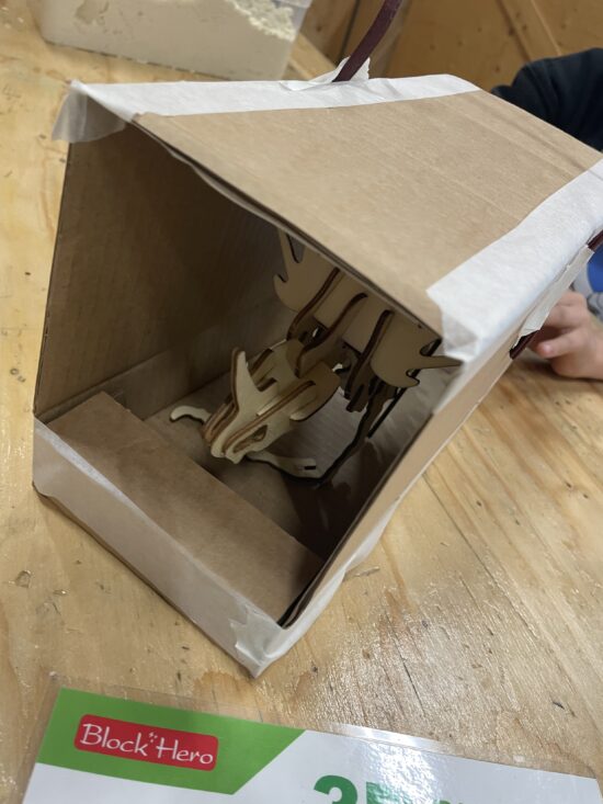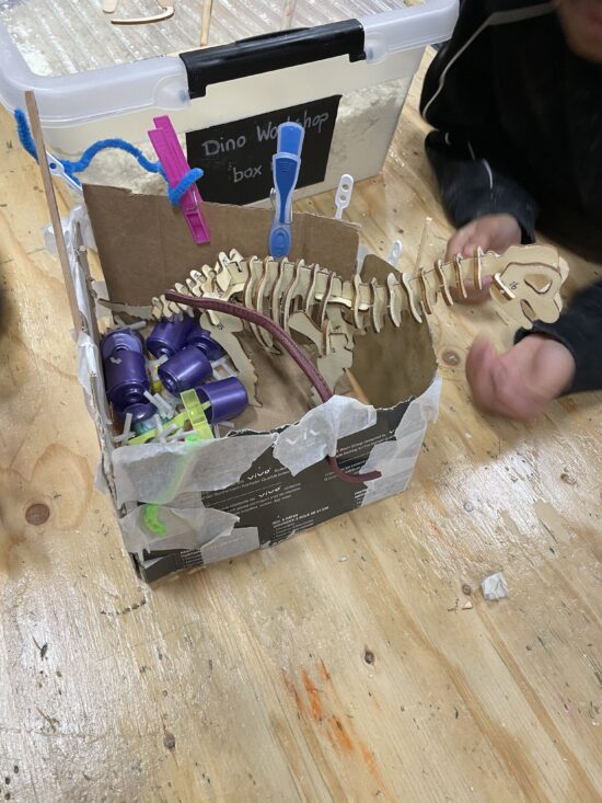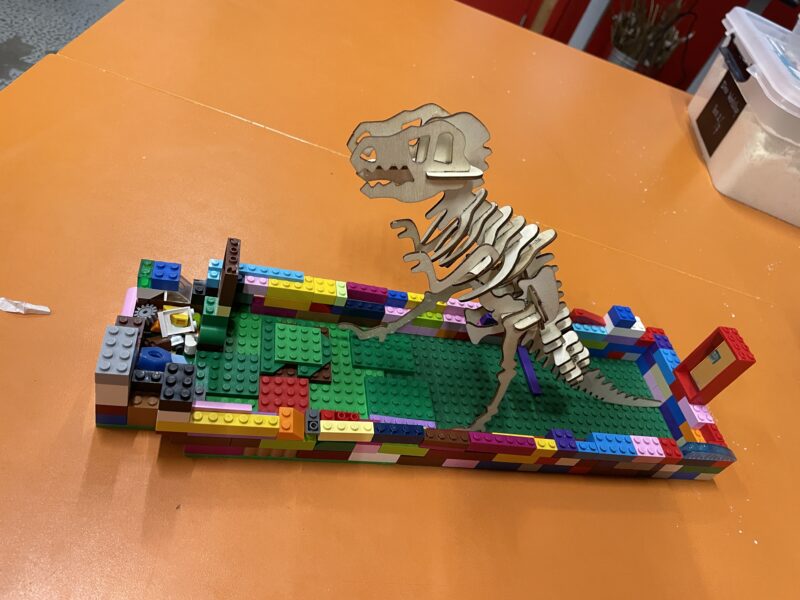 Daarna mogen ze nadenken over wat voor hok of vervoermiddel een dergelijke dino nodig zou hebben, als deze nu nog zou bestaan en we hem in een dierentuin zouden willen laten zien. Dan worden er teams gemaakt en gaan de kinderen in tweetallen verder: één tweetal gaat het skelet in elkaar zetten en het andere tweetal gaat met het bouwen aan de slag. Het specifieke hok of vervoermiddel gaan ze bouwen voor hun dino. Aan het einde bespreken en presenteren we de dino’s en de hokken.