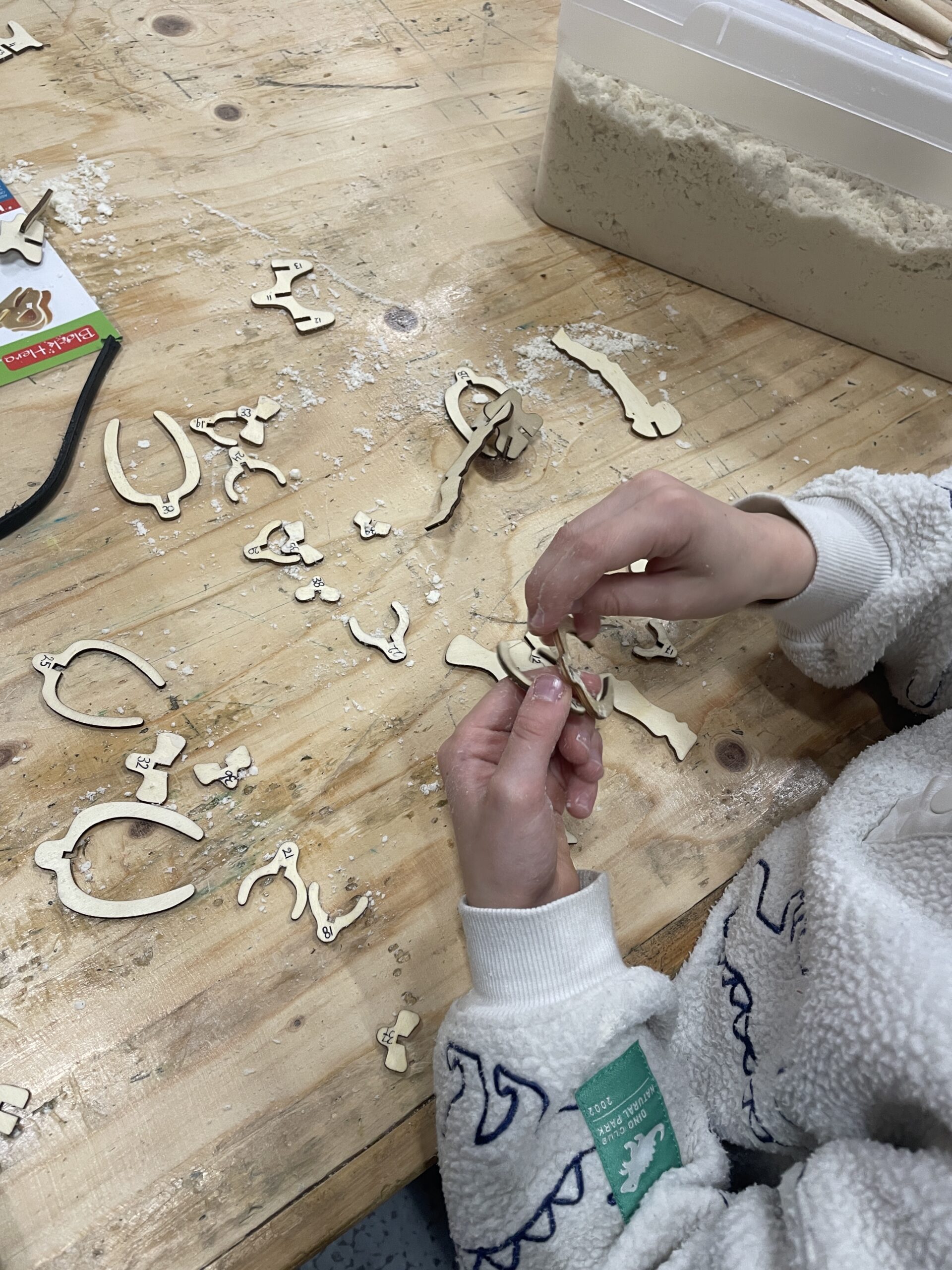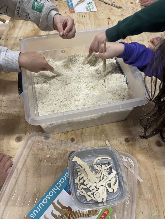 Bij het thema ‘Schatten van de Aarde’ hebben we een leuke nieuwe workshop ontwikkeld: Het opgraven van dinosaurusbotten en daar een bouwopdracht mee uitvoeren.